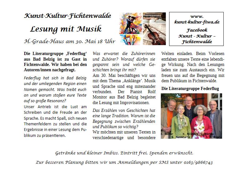 Die Literaturgruppe ‚Federflug‘ aus Bad Belzig ist am 30. Mai 18 Uhr zu Gast im Hans-Grade-Haus in Fichtenwalde. Getränke und kleiner Imbiss. Eintritt frei. Spenden erwünscht. Anmeldungen per SMS unter 0163/9866743.