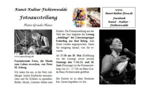 Eröffnung 20.5.2026 17:30 Uhr Finissage 28.6.2026 15 Uhr Hans-Grade-Haus Fichtenwalde
